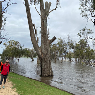 Um 10.00 Uhr geht’s los, zuerst auf Landstrassen, später auf dem Highway. In diesem Gebiet werden Citrusfrüchte angebaut, vor allem Zitronen und Orangen. Wir klauen ein paar Orangen, aber nur solche die am Boden liegen und so oder so verfault wären. In Waikerie, ein kleines Städtchen am Murray River, machen wir Rast und essen am River einen Snack. Wir kommen mit einem Einheimischen ins Gespräch und er erzählt uns Interessantes aus der Gegend. Der Murray River ist jetzt schon sehr hoch und vielerorts schon über die Ufer getreten. In 2-3 Wochen wird eine noch grössere Überschwemmung erwartet, da es im riesigen Einzugsgebiet des Rivers viel geregnet hat und noch regnen wird. Er führt uns auf einen Aussichtspunkt, von wo aus wir den River und das schon jetzt überschwemmte Gebiet sehen können.